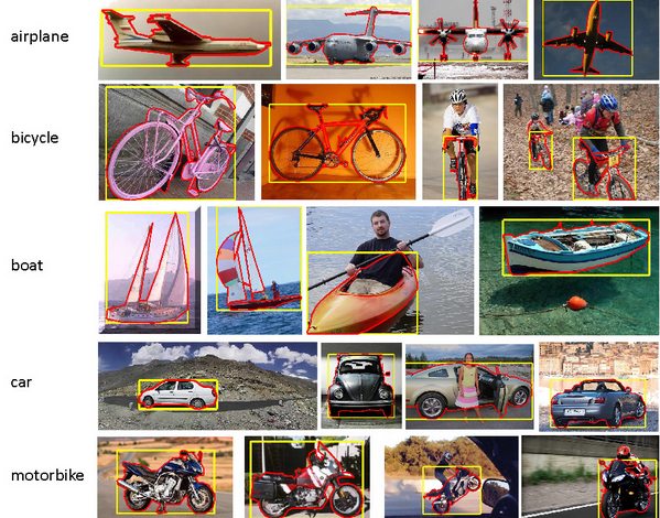 There are 5 categories, i.e. airplanes, boats, cars, motorbikes, and bicycles, and each category contains 200~500 images.